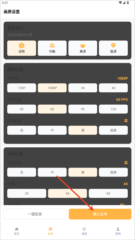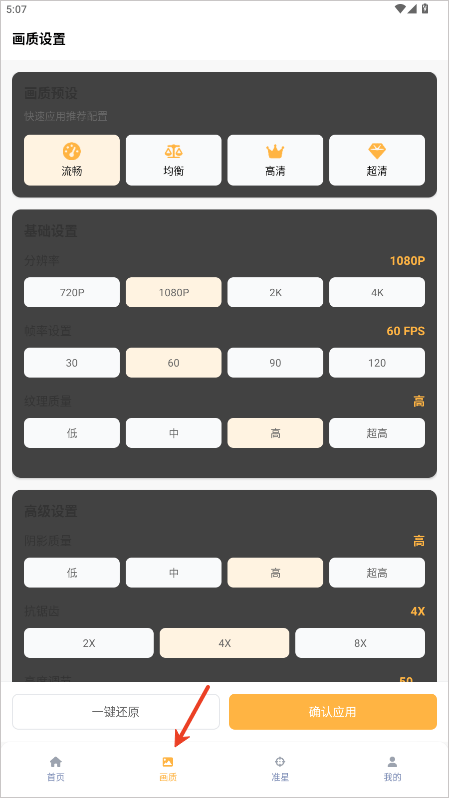 准星怪兽app中,除了能够进行物理准星的调试外,还内置了画质调整功能,能够让玩家在游戏的过程中,突破设备的极限,轻松解锁120帧、4K分辨率,还拥有抗锯齿、GPU优化、画面风格、阴影等多种不同的设置,让你可以轻松的更改自己喜欢的画面;倘若不知道自己喜欢的画质,还可以一键使用软件中自带的画质配置——竞技模式、画质均衡、超清画质等,给你更便捷的游戏操作。