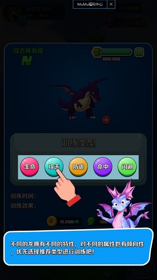 点击“+”可以进行选择,不同龙拥有不同的特性,对不同属性也有倾向性,优先选择推荐类型进行训练吧!