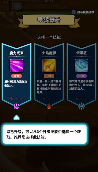 4、每提升一级可从多种技能中选择其一,合理搭配可快速清理单体与小范围敌人,加快升级节奏。